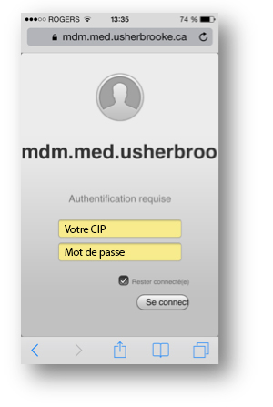 Entrez l’adresse suivante: https://mdm.med.usherbrooke.ca/mydevices tel qu’illustré ci-dessous. Dans le champ Nom D’utilisateur, entrez votre CIP; Dans le champ Mot de passe, entrez votre mot de passe Cliquez sur Se connecter. ![]()