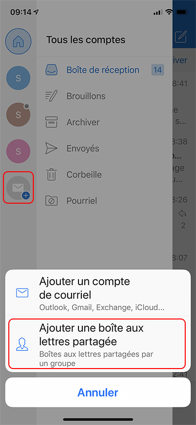 Appuyez sur le bouton Ajouter un compte dans le volet de navigation gauche , puis sur Ajouter une boîte aux lettres partagée. ![]()