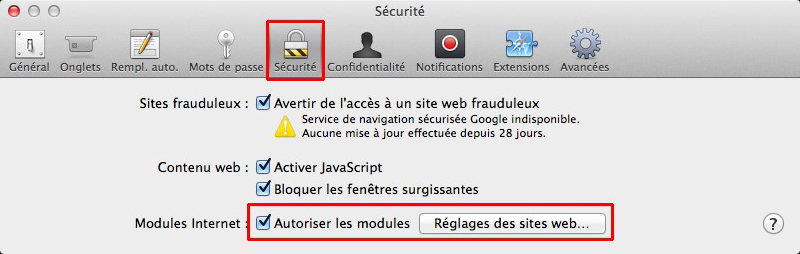 Ouvrir les préférences de safari et sélectionnez l'onglet "Sécurité".