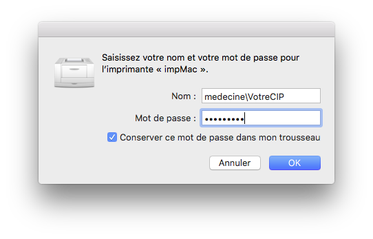 NB. Si cette fenêtre n'apparaît pas, imprimez quelque chose et vous verrai l'imprimante dans votre Dock avec un triangle jaune dessus. Sélectionnez la et ce sera indiqué: En attente d'authentification. Cliquez sur la flêche ronde à droite et la fenêtre apparaîtera.