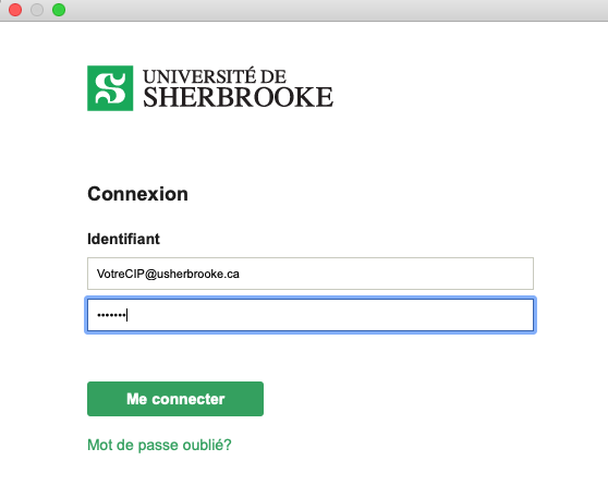 Dans la fenêtre de connexion, entrez VotreCIP@usherbrooke.ca ainsi que votre mot de passe.
