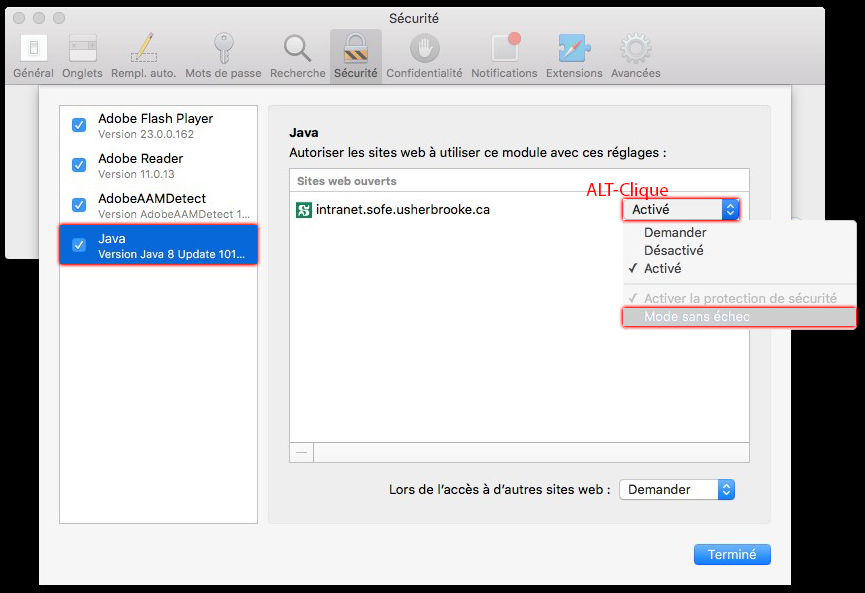 Faire ALT-Clique sur la boite de sélection à la droite de "intranet.sofe.usherbrooke.ca" et décochez "Mode sans échec". ![]()