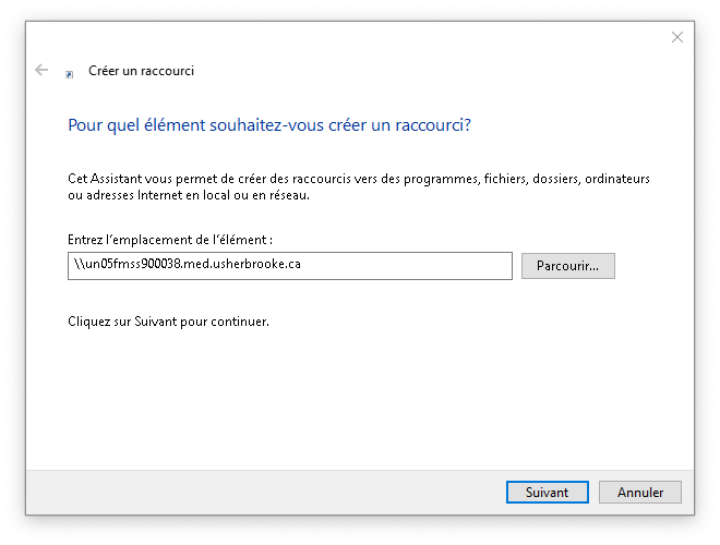 Faites un clique droit sur le bureau de votre ordinateur: Nouveau\Raccourci Entrez l’emplacement: \\un05fmss900038.med.usherbrooke.ca et appuyez sur Suivant Nommez le raccourci: Serveur imprimantes et appuyez sur Terminer