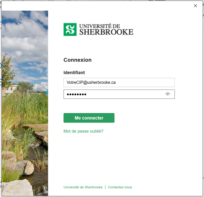 Dans la fenêtre d'authentification, l'identifiant doit être VotreCIP@usherbrooke.ca et votre mot de passe.