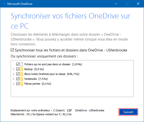 Choisissez les éléments à synchroniser.Cliquez Suivant pour terminer. Vous trouverez à présent vos fichiers de OneDrive Entreprise dans l'Explorateur de fichiers dans Windows.