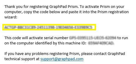 Vous recevrez un courriel intitulé : « GraphPad Prism activation code for (nom de votre ordi) » à l’intérieur duquel il y aura le code d’activation. Sélectionnez le et faite (ctrl-c) pour le copier en mémoire. Vous pouvez fermer votre fureteur. ![]()
