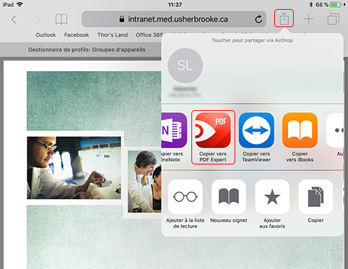 Premièrement, ouvrir le document PDF dans Safari et cliquer l'icône de partage. Sélectionnez ensuite Copier vers PDF Expert. ![]()
