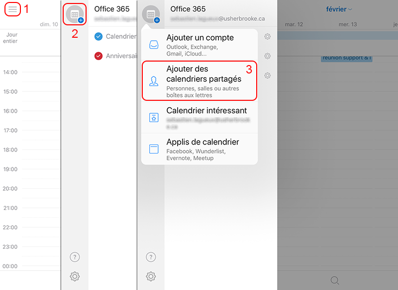 Dans Outlook, Calendrier, menu (1), Ajouter un calendrier (2), Ajouter des calendriers partagés (3).