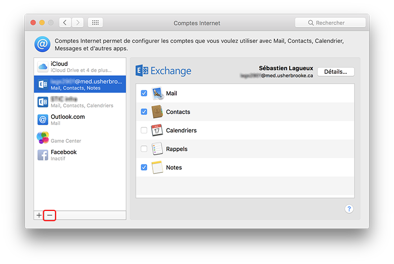 Dans les Préférences Système du Mac, Compte Internet, sélectionnez le compte Exchange avec VotreCip@med.usherbrooke.ca et cliquez le - en bas pour le supprimer. ![]()